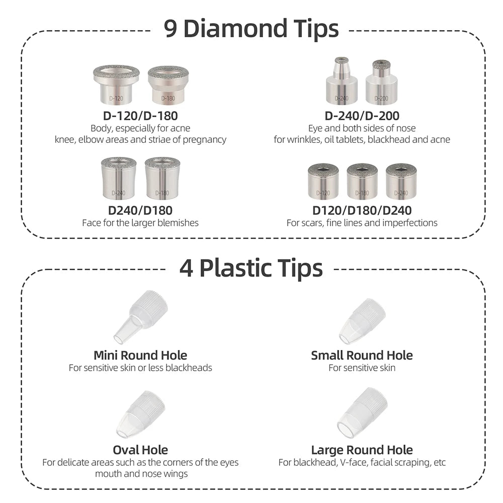 - Exfoliation & Peeling – Diamond tips gently remove dead skin and impurities.